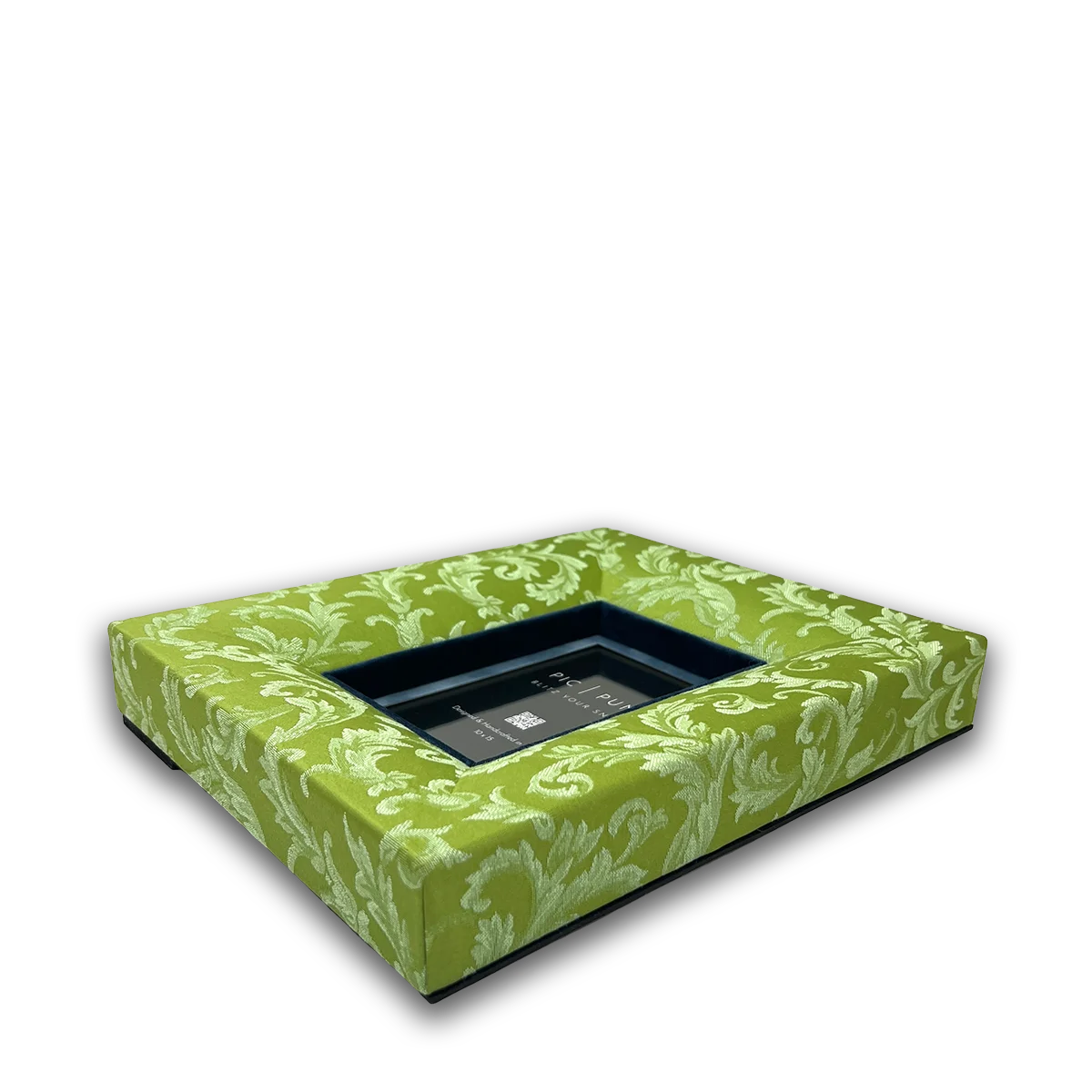 Der Rahmen aus massiver Fichte ist mit feinem Jacquardstoff in frischem Blattgrün bespannt, dessen zeitlose Eleganz und berührende Farbgebung die Herzen immer wieder in ihren Bann zieht.