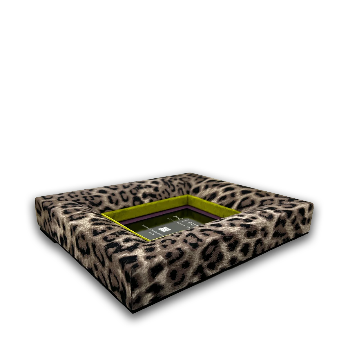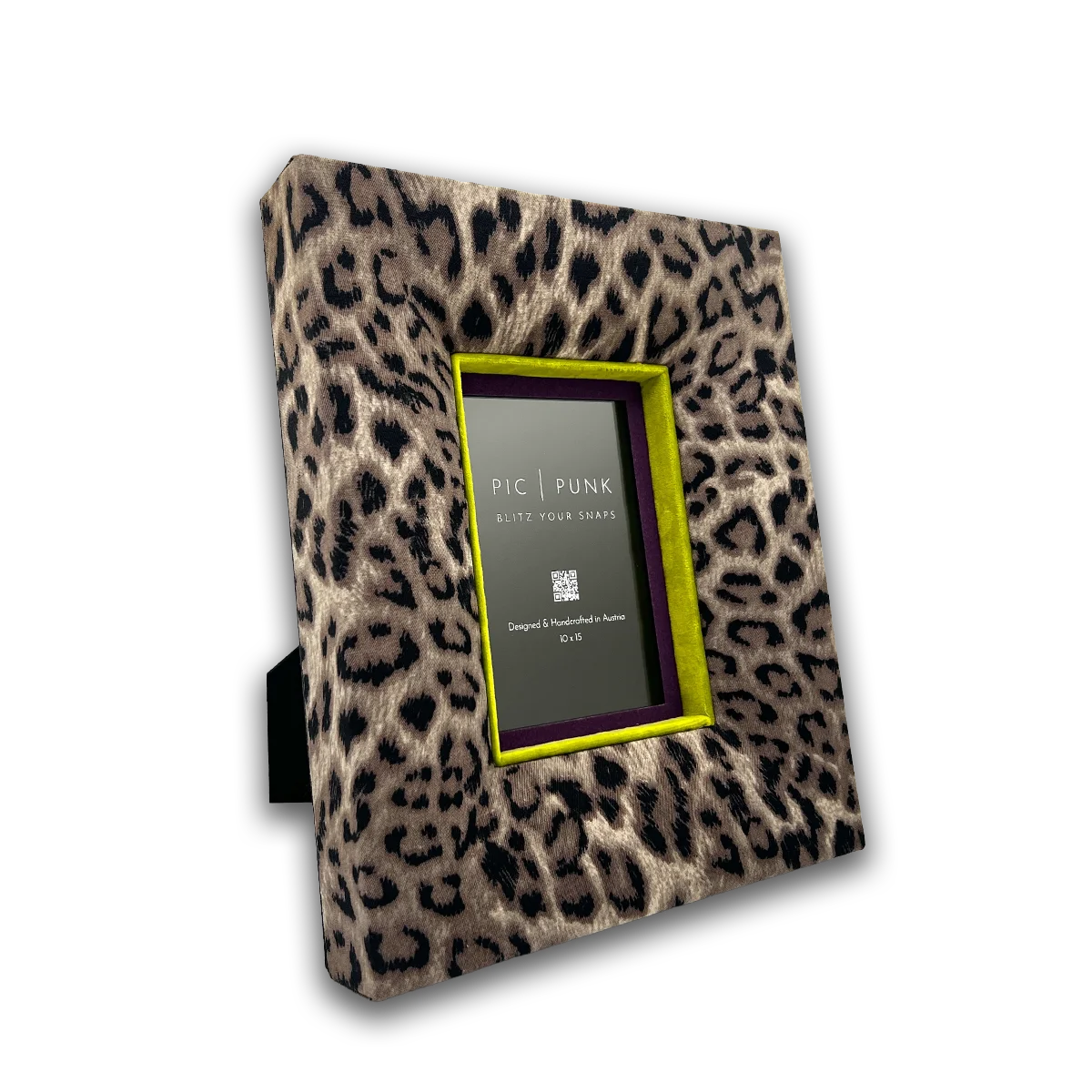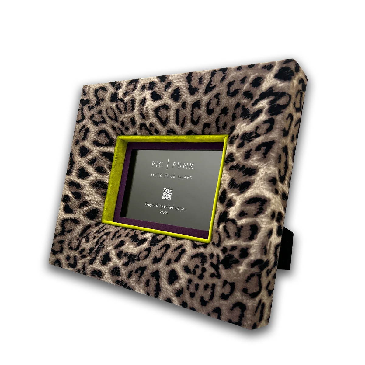Der Rahmen aus österreichischem Fichtenholz ist mit einem hochelastischen, aufregenden Stoff bezogen, der einer urbanen Wildkatze gleicht und zugleich Wildheit und Ästhetik perfekt widerspiegelt.